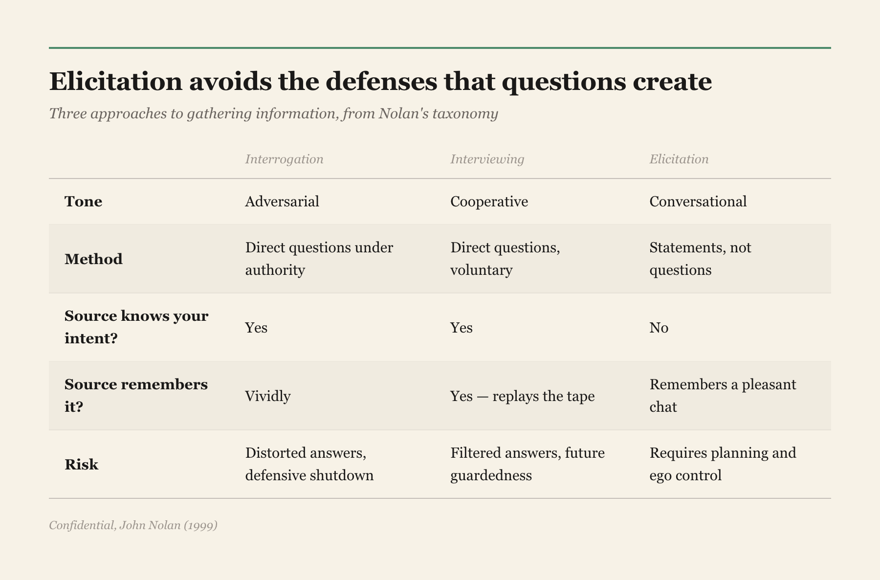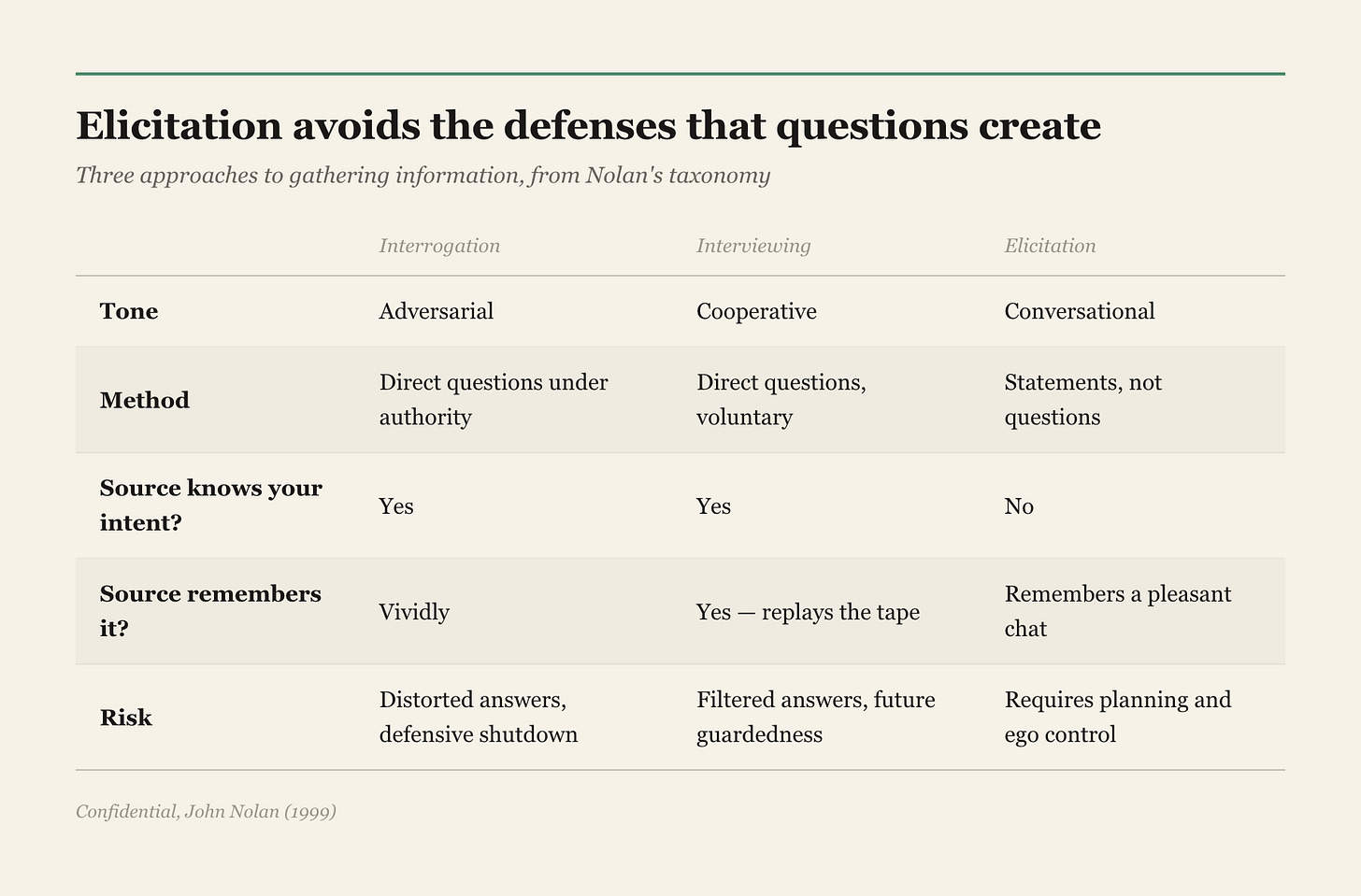 As Nolan explains, elicitation is expressly distinct from interrogation and interviewing. “Interrogation [is] obtaining what you want from someone who possibly has it, who has not admitted to having it, and who knows who you are and why you want it,” he writes. Meanwhile, “interviewing is the process of obtaining information from someone who probably has it, who has more or less admitted to having it, and who knows who you are and why you want it.” Interrogation is, by definition, adversarial, while interviewing tends not to be.