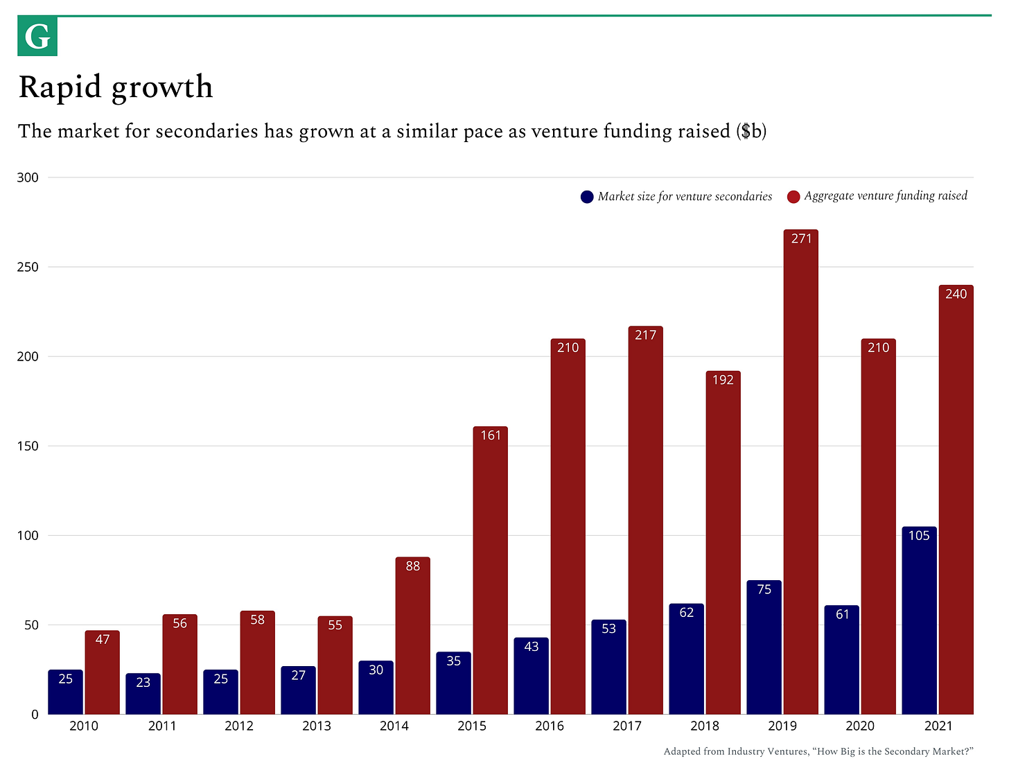 According to Industry Ventures, the global addressable market for secondary transactions in venture was $25 billion in 2012. A decade later, it had hit $105 billion – a 4.2x increase. That quantifies just how rapidly this part of the venture asset class has grown and illustrates the scale of the opportunity for both buyers and sellers.