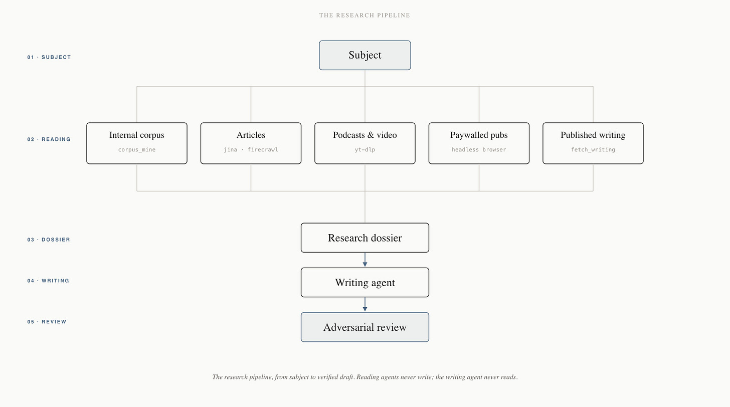 Fundamentally, my research system operates through a collection of agents dedicated to snuffling out relevant information from particular mediums. One scans my internal corpus for existing work. Another reads relevant articles. A third seeks out podcast appearances.